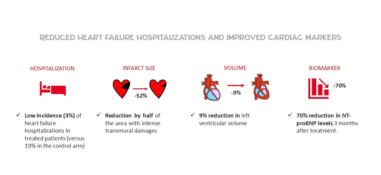 - However a severe heart attack (about 30% of the cases) leads to a chronic heart failure that weakens heart function and reduces life expectancy (survival rate of 50% at 5 years), despite the daily administration of conventional therapies whose actions are mainly symptomatic.
